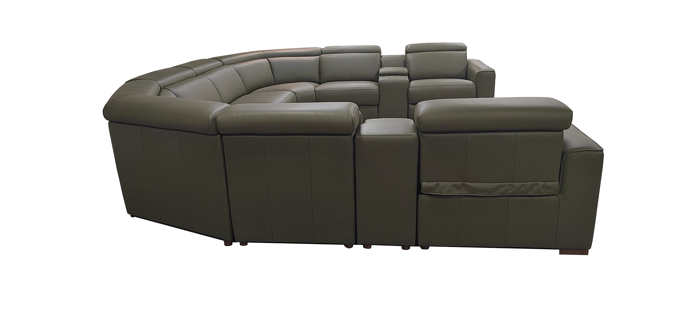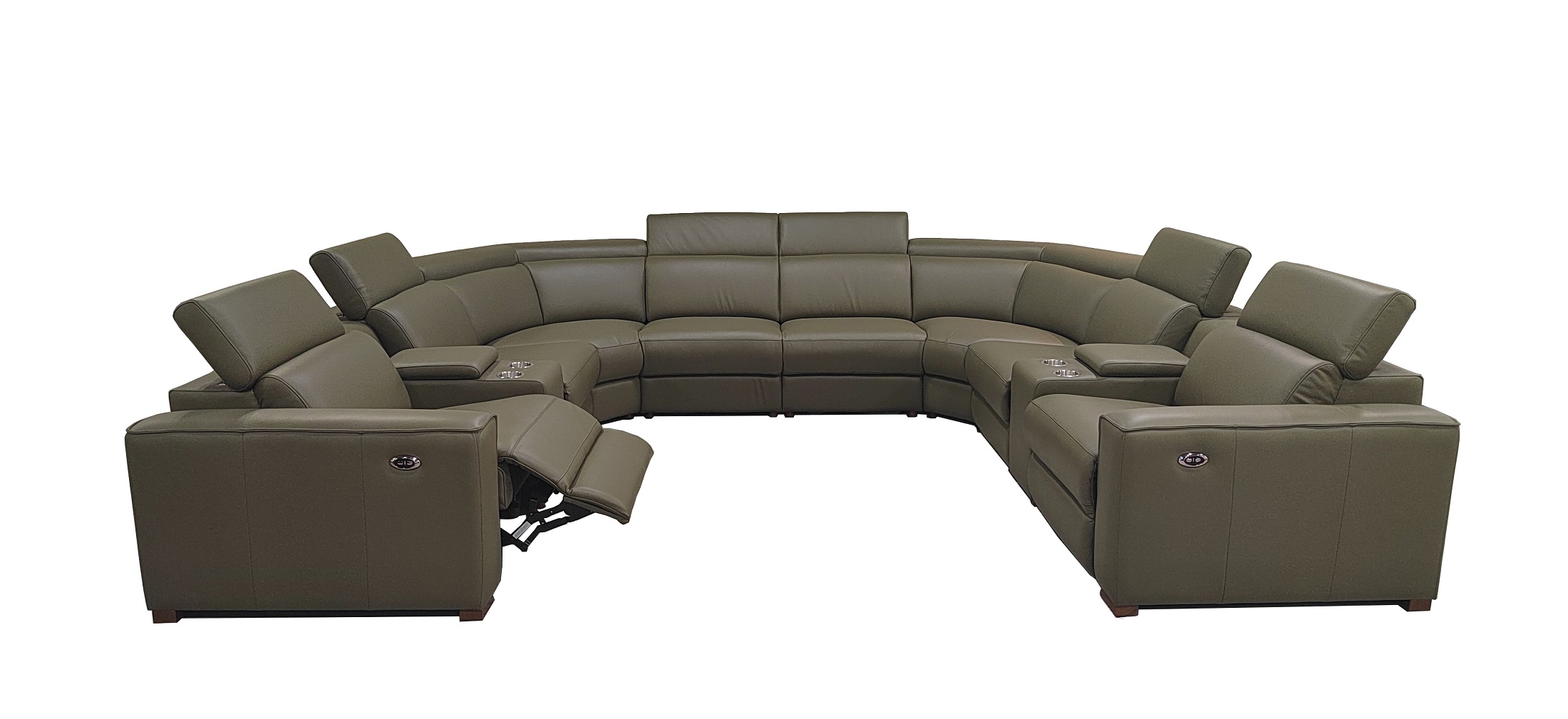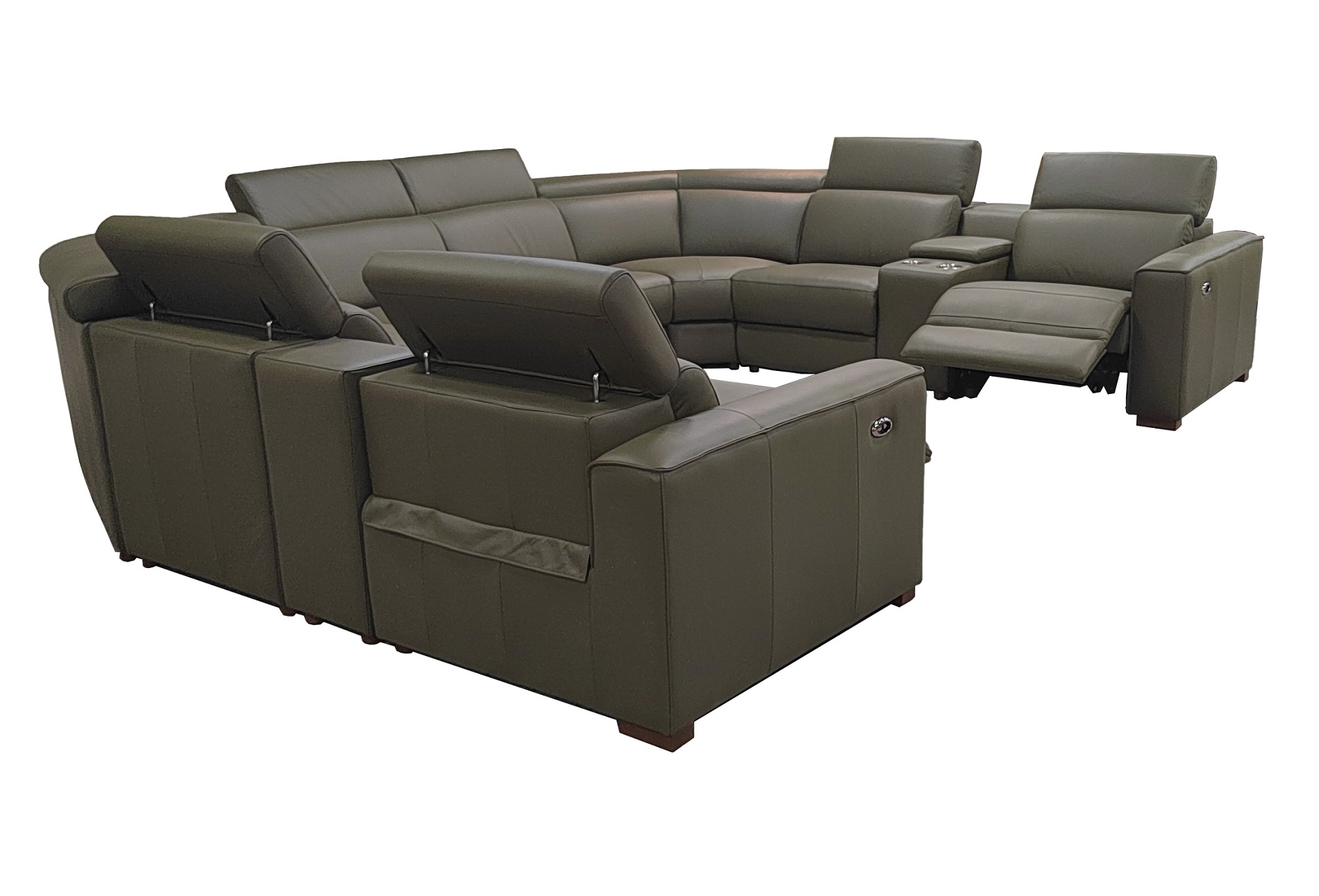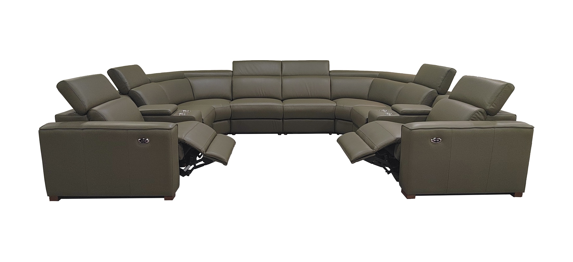 4, The end seats feature power reclining mechanisms, while other module is equipped with an adjustable manual headrest for personalized neck support.